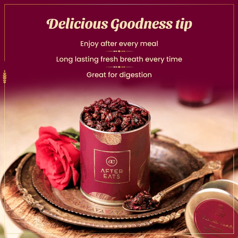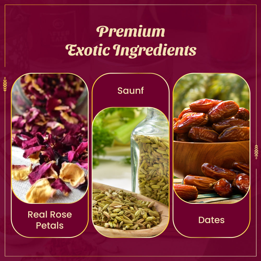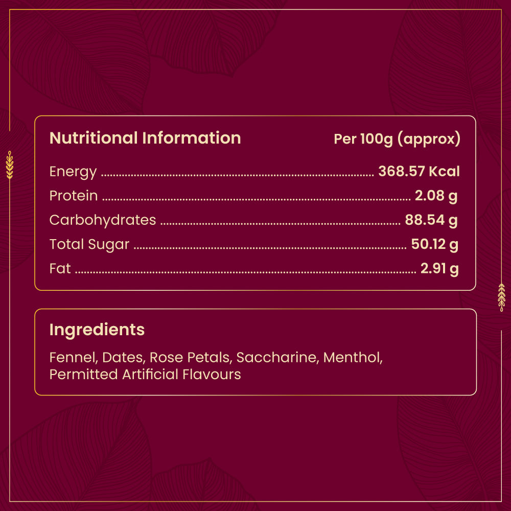 Discover the irresistible taste of our premium mouth freshener made with authentic Indian Rose petals, aromatic Saunf (fennel seeds), and rich Arabian Dates. This exclusive mouth freshener is low in sugar, high in taste, and perfect for refreshing your breath after meals. Enjoy a natural, flavorful treat that combines the best of tradition and taste!